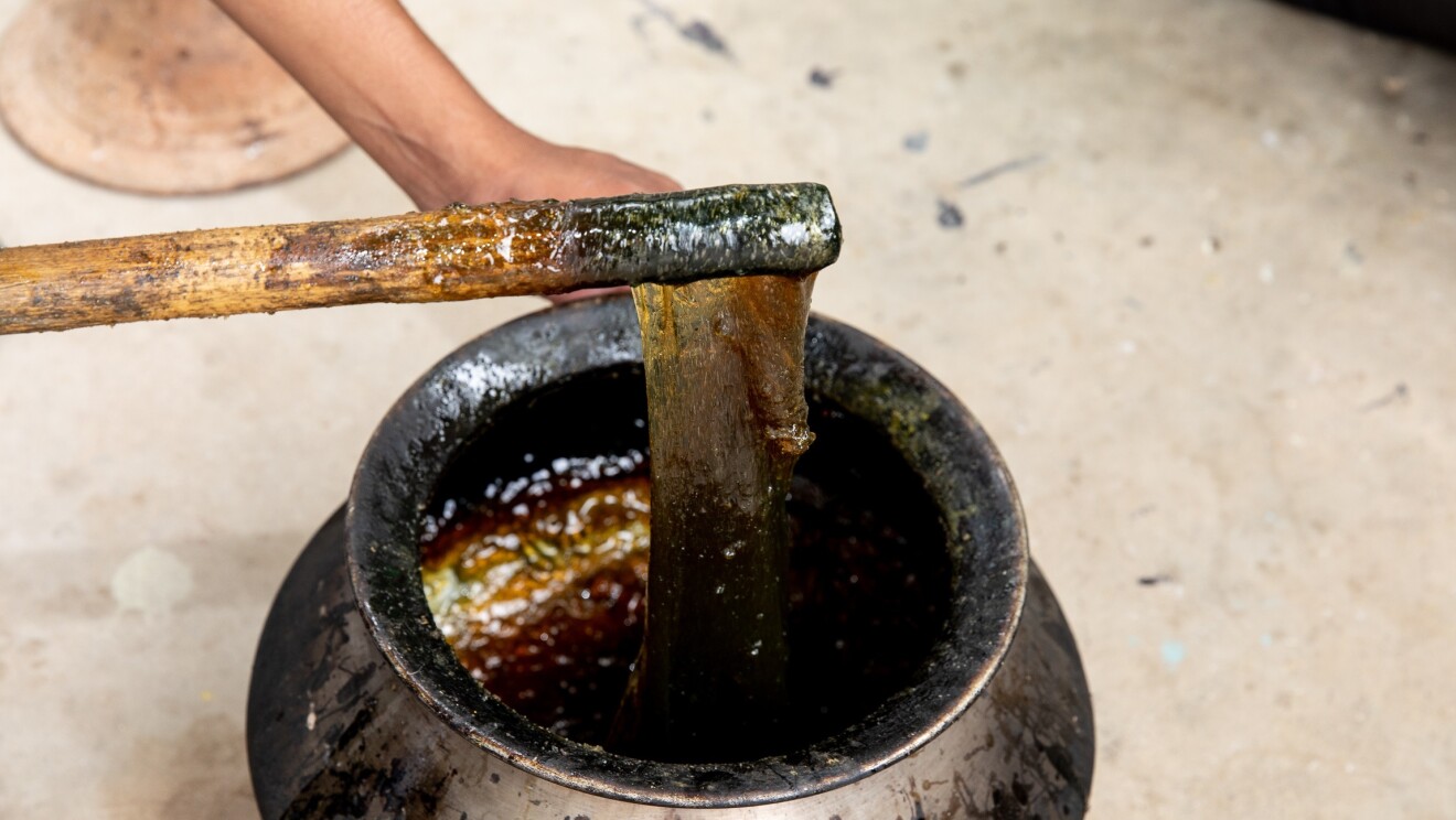 As one artisan dips into the color tray and picks a color and smoothens it with the 6-inch thin metal rod, Gafoor says, “Creating this color is the base of Rogan art.” He adds with a laugh, “While I can’t reveal all, what I can tell you that Rogan art is made from castor oil. It’s heated for 5-6 hours – with the temperature constantly monitored and stirred often. Once we arrive at the exact consistency, we cover it and keep it to cool. This gooey mix is called Rogan. We then mix the colour in it and that it what is used to paint.” (See the video for the Rogan process)