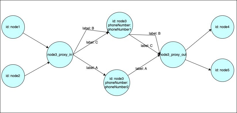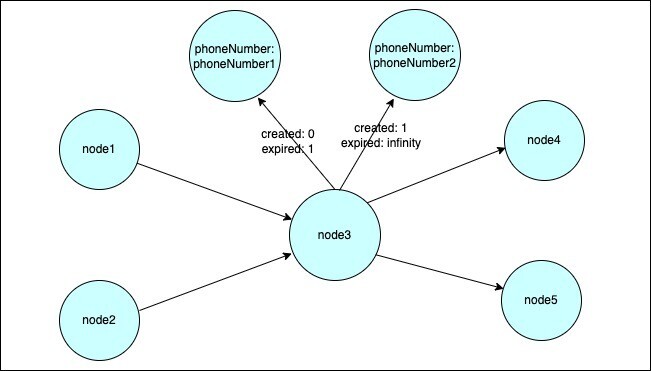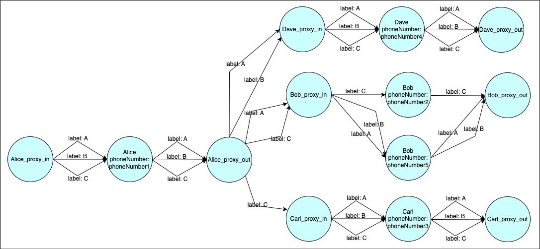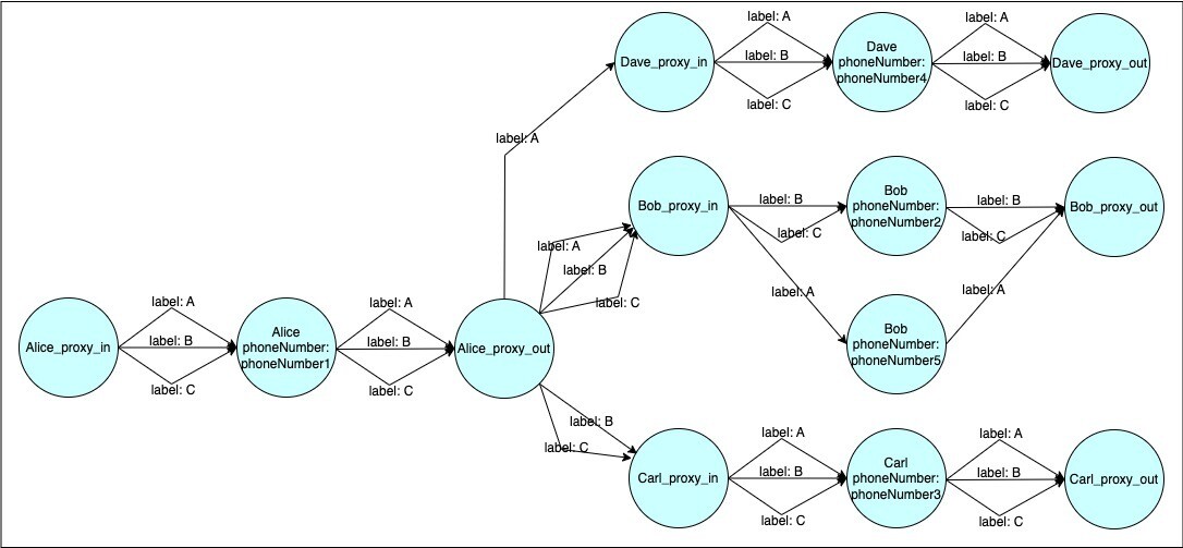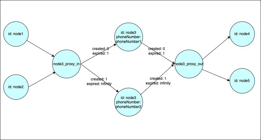 - To update the phoneNumber property of ‘Bob’, create a new ‘Bob’ node and connect it to corresponding proxy nodes through ‘A’ edges (use a unique identifier such as ‘Bob_<uuid>’)