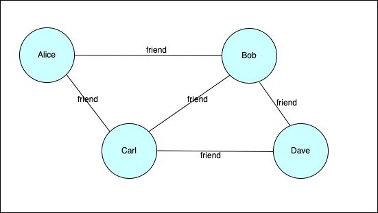 This graph consists of four nodes (Alice, Bob, Carl, and Dave) and five edges representing the relation ‘friend’ between specific pairs of nodes.